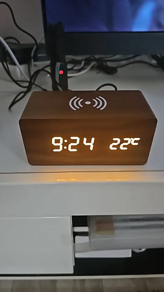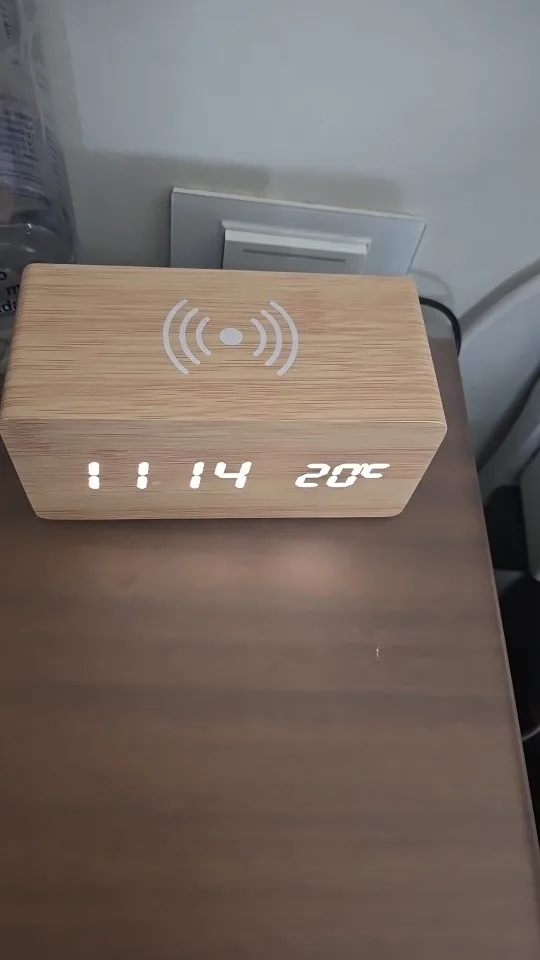 Wake up to timeless design and modern convenience with this Wooden Alarm Clock featuring wireless charging and temperature display. Crafted from sustainable materials, this multifunctional bedside essential combines vintage-inspired aesthetics with smart technology—charge your phone wirelessly while enjoying a clear view of the time, date, and room temperature. Perfect for minimalist spaces and eco-conscious homes, it brings warmth and functionality to any bedroom or desk.